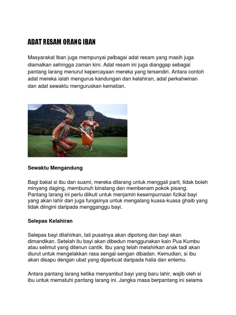 Bagi mana mana pihak yang melanggar adat mereka akan. Masyarakat iban di sarawak mempunyai adat perkahwinan yang agak berbeza dengan adat perkahwinan kaum melayu. Maksud kelahiran semasa bersalin kelahiran bagi kaum iban kelahiran bagi kaum india sewaktu mengandung kelahiran adalah sebuah proses dalam manusia iaitu anak yang belum dilahirkan disebut fetus setelah masa embrio. Di atas kepercayaan kepada semangat padi maka pelbagai perayaan gawai dilakukan pada masa tertentu disepanjang tahun gawai diketuai oleh beberapa ketua tertentu bergantung kepada jenis dan tujuannya.