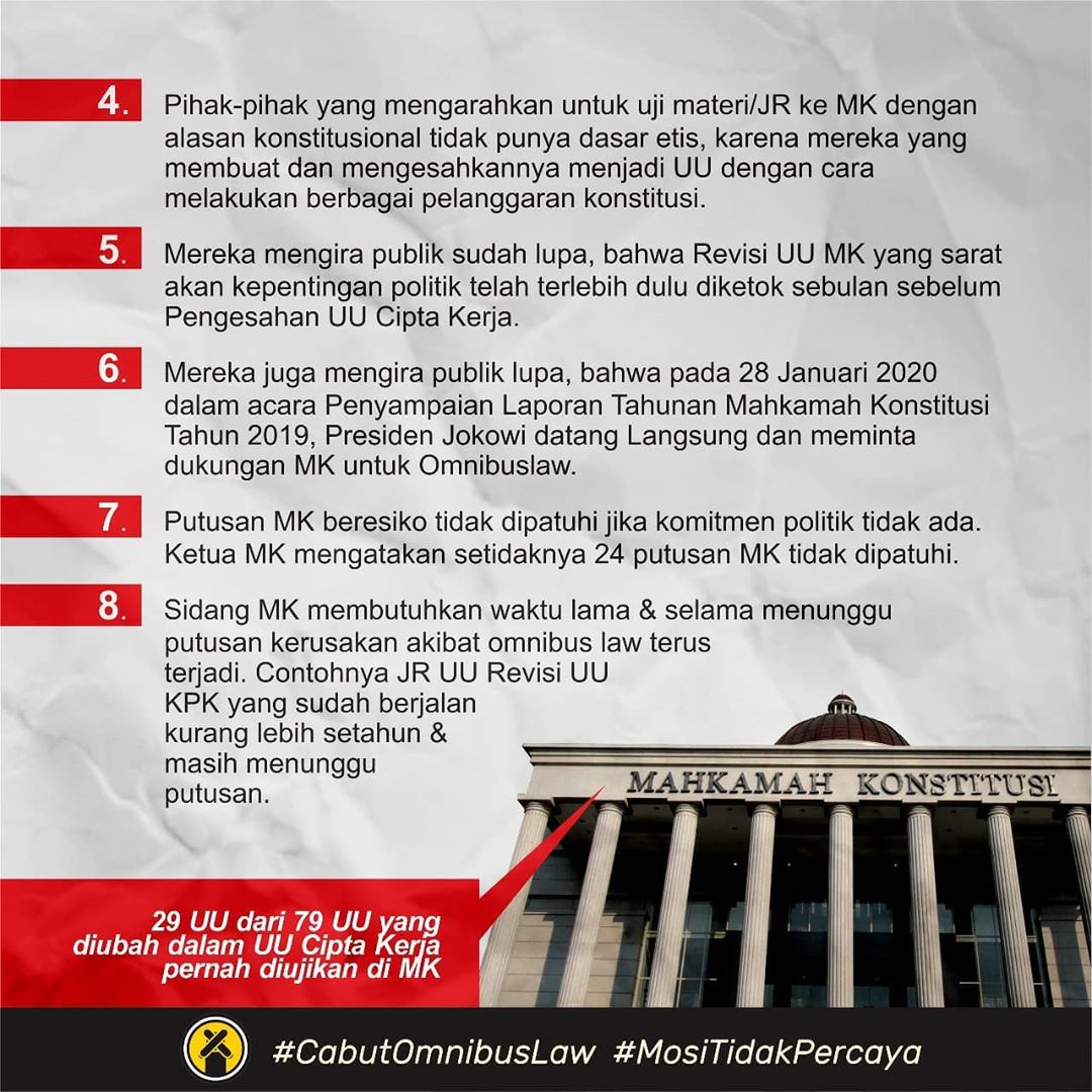 Omnibus law atau perampingan aturan sesungguhnya terdiri dari beberapa rancangan undang undang ruu atau yang juga dikenal sebagai kluster terkait beberapa sektor di mana secara keseluruhan. Saat itu jokowi mengungkapkan rencananya mengajak dpr untuk membahas dua undang undang yang akan menjadi omnibus law. Undang undang ini dimaksudkan untuk merampingkan regulasi dari segi jumlah. Dalam aksinya mereka menolak omnibus law rancangan undang undangan ruu cipta kerja karena dinilai lebih menguntungkan pengusaha serta mengancam akan melakukan mogok nasional pada 6 8 oktober 2020 atau saat sidang paripurna dpr membahas ruu cipta kerja.