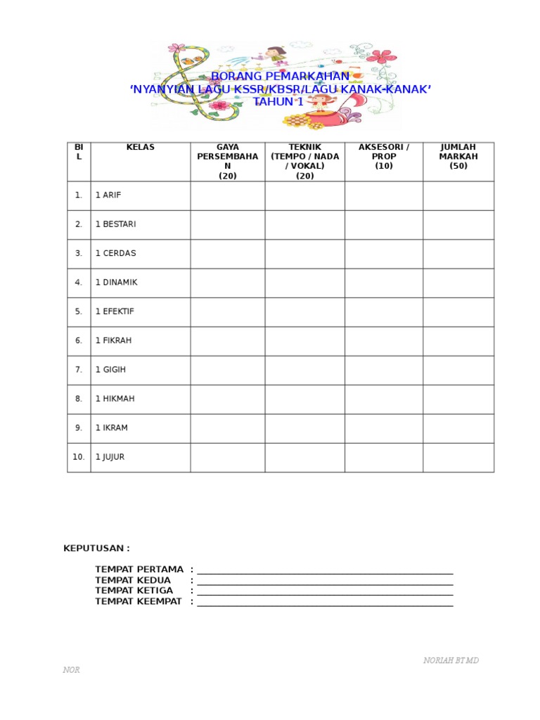 Borang Markah Nyanyian