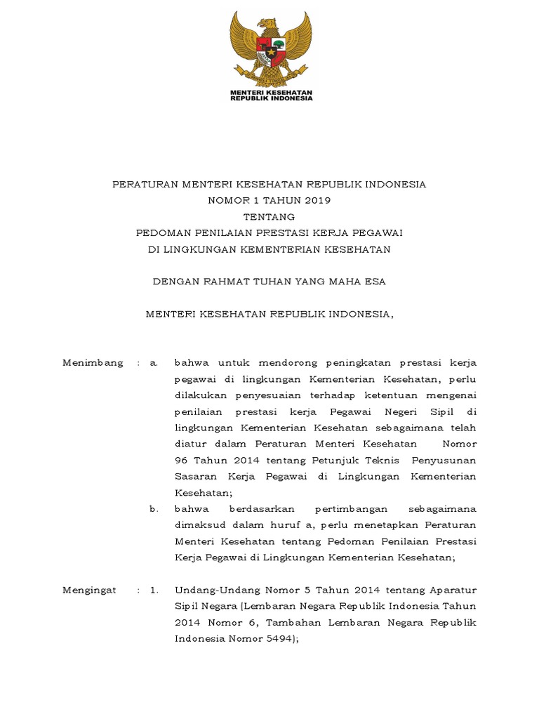 Pmk No 1 Th 2019 Ttg Pedoman Penilaian Prestasi Kerja Pegawai Kemenkes Pdf