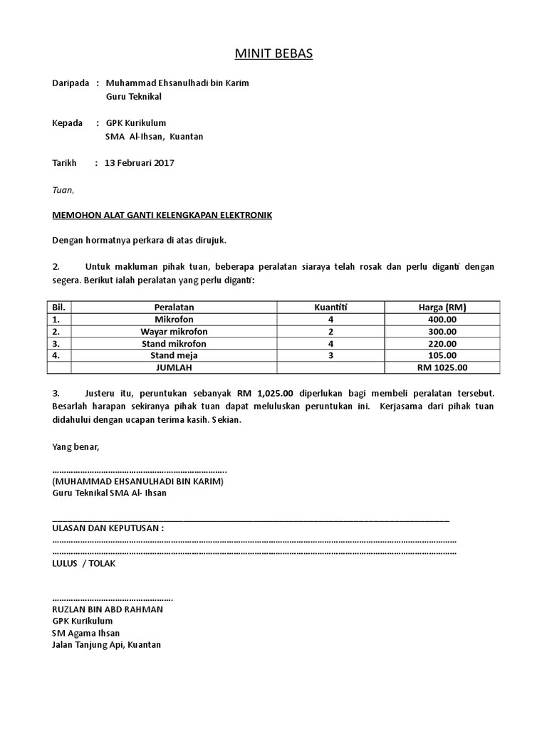 Contoh kertas kerja mohon peruntukan membeli peralatan. Kertas permohonan kelulusan teknikal projek ict kict kementerian pendidikan malaysia kpm bagi perolehan nama projek 1. Buku panduan pengurusan aktiviti kokurikulum sekolah rendah dan sekolah menengah. Kertas kerja ini dikemukakan untuk mendapatkan pertimbangan dan kelulusan daripada pengetua sekolah menengah kebangsaan kampong jawa untuk membeli peralatan kesenian murid murid berkeperluan khas menjalankan aktiviti kesenian dan kebudayaan dengan lancar. Tujuan tujuan kertas kerja ini dikemukakan kepada jawatankuasa kelulusan teknikal projek ict kementerian pendidikan malaysia kpm adalah untuk mendapat pertimbangan dan seterusnya kelulusan teknikal ict bagi nama projek.