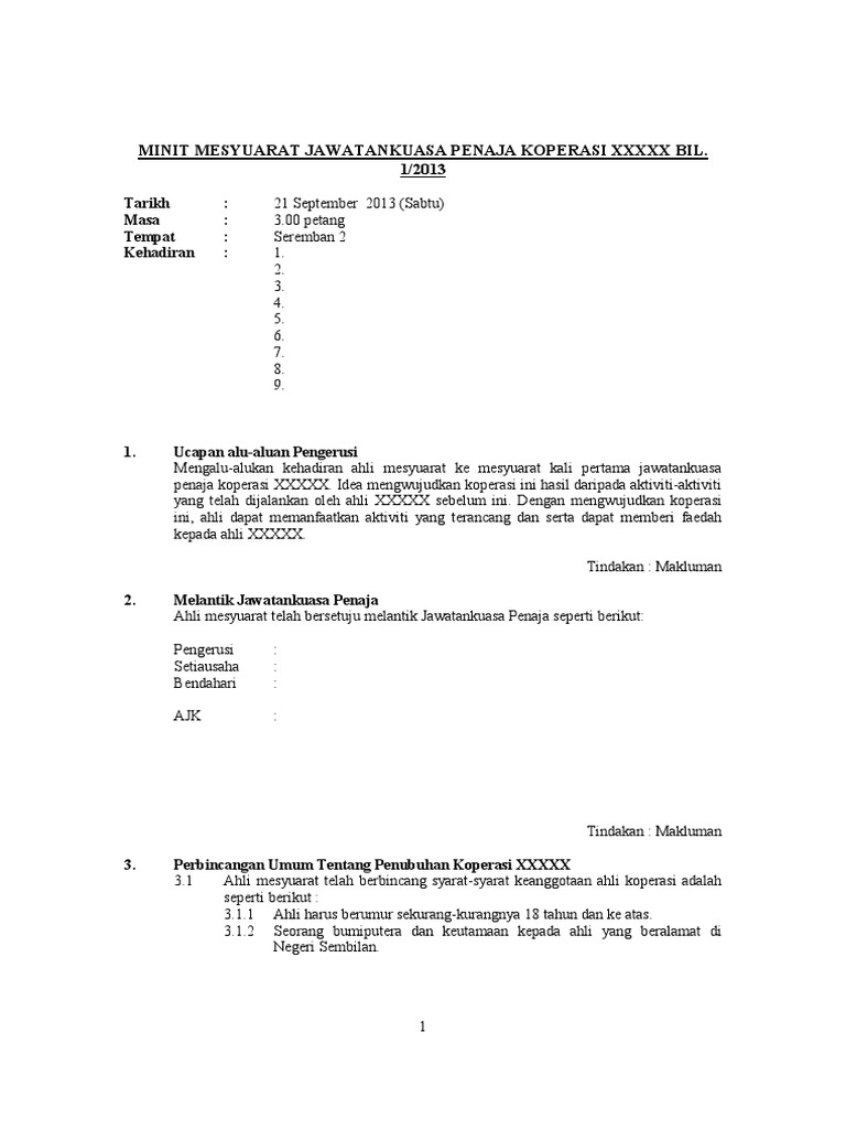 Contoh minit mesyuarat agung tahunan koperasi. Azman mat dengan lafaz bismillah serta berbanyak terima kasih diatas kepercayaan semua anggota untuk beliau mempengerusikan mesyuarat agung kali ke 8 tahun 2008 ini. Di awal penubuhannya pada bulan julai 1922 jabatan yang dikenali sebagai the office of the director of co operation ini berfungsi untuk menubuh mendaftar dan membangunkan syarikat bekerjasama sama di bawah enakmen. Suruhanjaya koperasi malaysia skm adalah satu entiti yang telah diperbadankan pada 1 januari 2008. Skm sebelumnya dikenali sebagai jabatan pembangunan koperasi malaysia jpk.