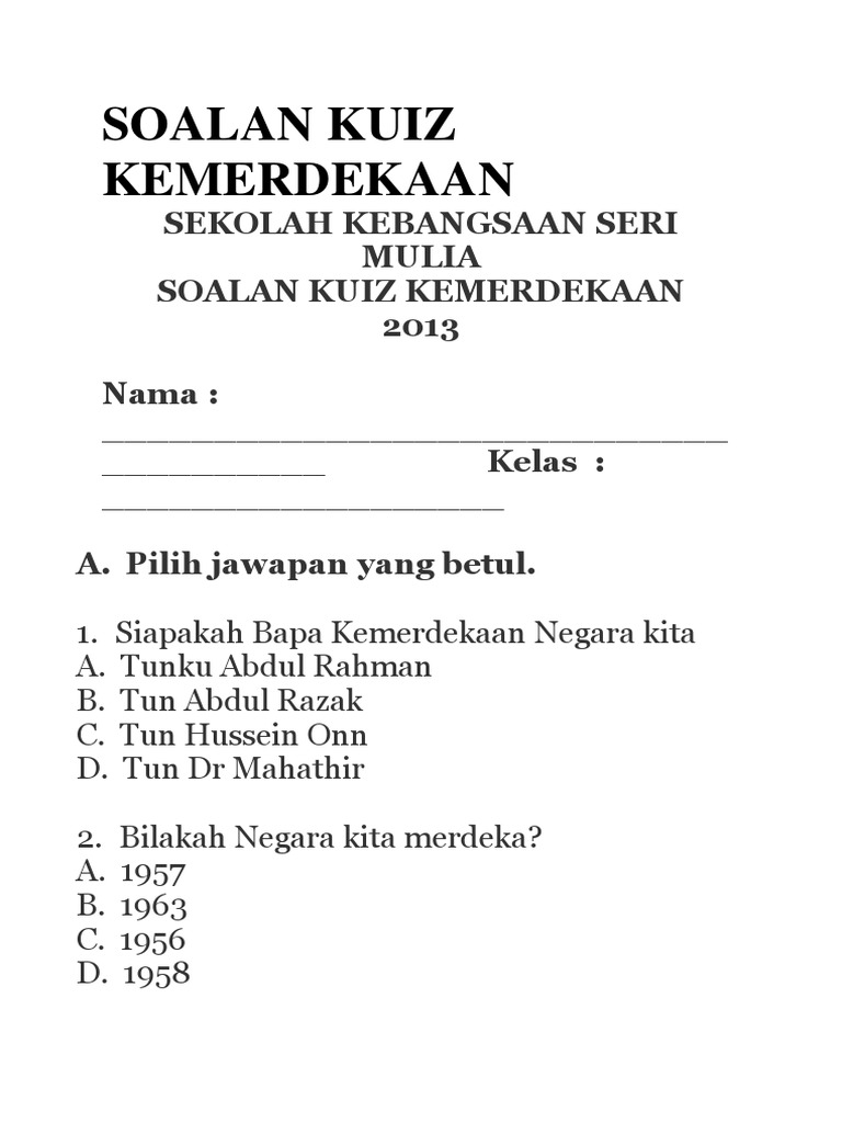 Di sini terdapat banyak kategori soalan yang adik boleh buat dan baca. Pertandingan dijalankan dengan bantuan dan kerjasama guru guru dunia sejarah pendidikan seni visual pendidikan muzik dan pendidikan sivik dan kewarganegaraan dan pusat sumber sekolah. Sekolah kebangsaan seri mulia soalan kuiz kemerdekaan 2013 nama. Tidak kira apa kenapa kamu semua cari kuiz kemerdekaan sekolah rendah ini penulis bersedia untuk membantu bahan tersebut.