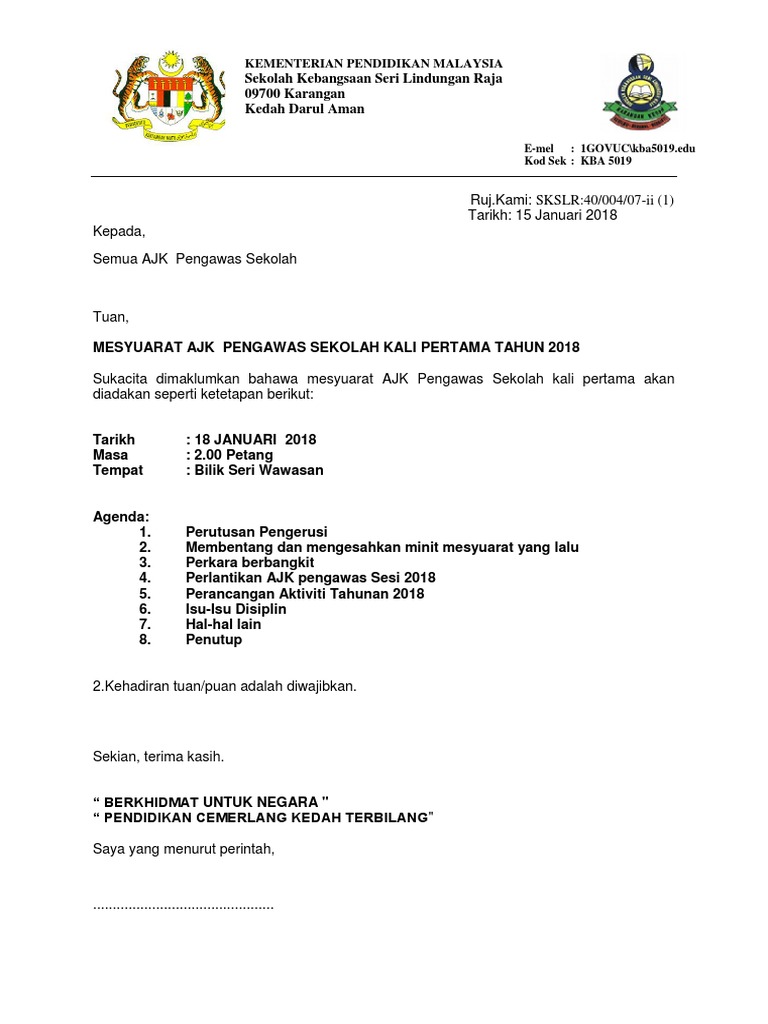 Surat Panggilan Mesyuarat Pengawas Kali Pertama Tahun 2018