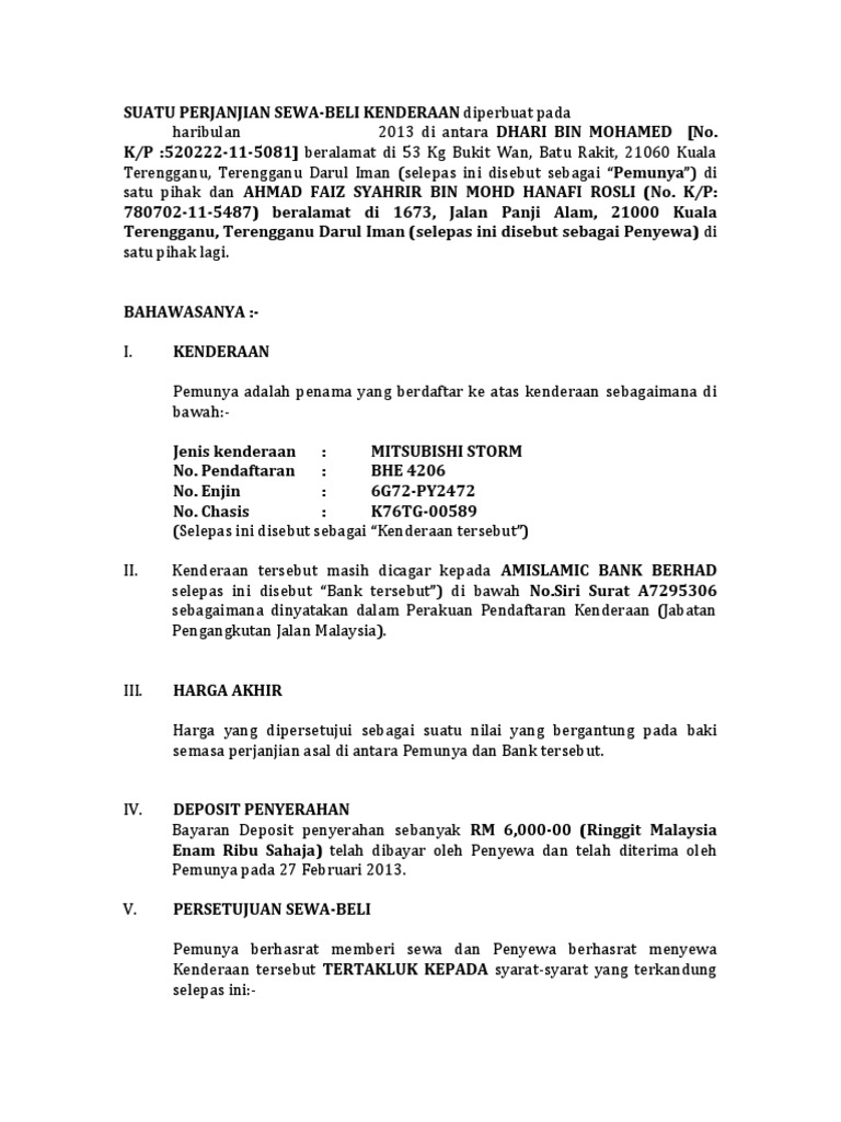 Pdf Surat Perjanjian Jual Beli Kereta Kaedah Sambung Bayar Roslina Mohd Zain Academia Edu