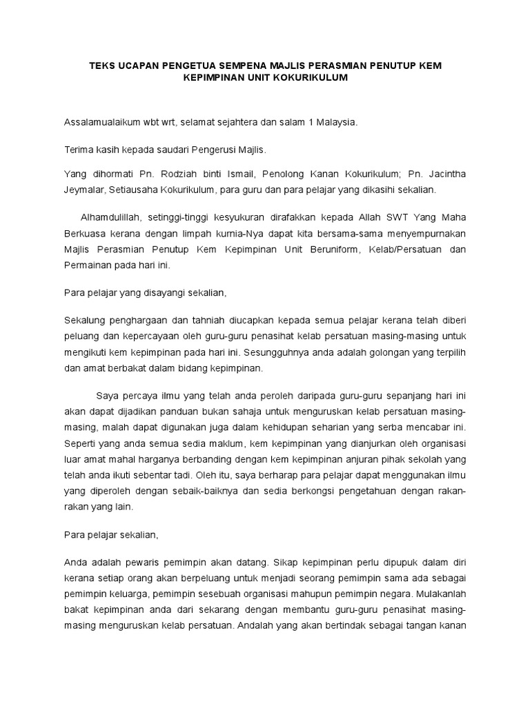 Teks Ucapan Pengetua Sempena Majlis Perasmian Penutup Kem Kepimpinan Unit Kokurikulum