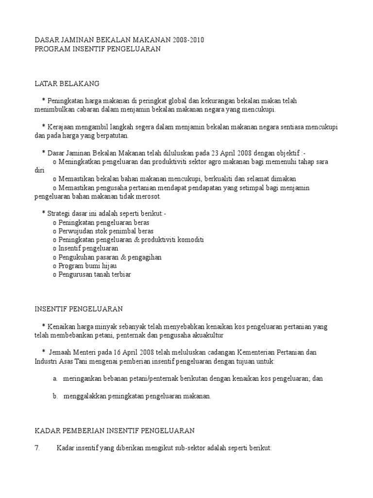 Dasar Jaminan Bekalan Makanan 2008 2010