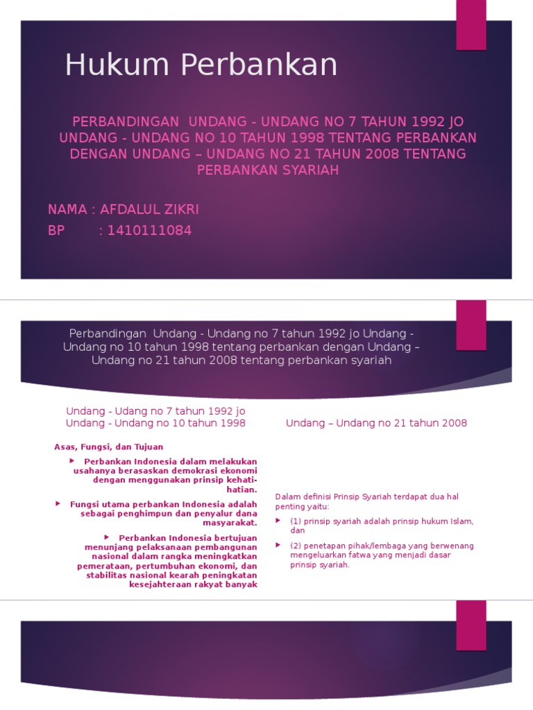 1410111084 Afdalul Zikri Perbandingan Undang Undang No 7 Tahun 1992 Jo Undang Undang No 10 Tahun 1998 Tentang Perbankan Dengan Undang Undang No 21 Tahun 2008 Tentang 1 Pptx