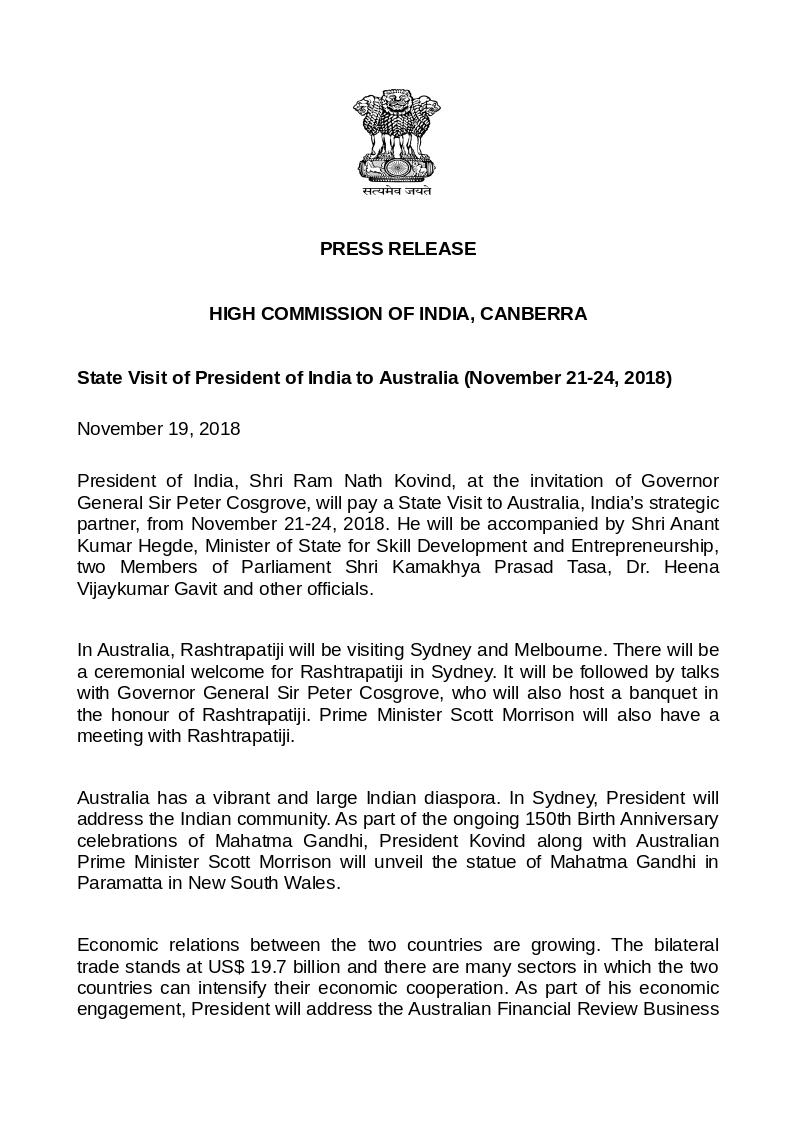 India In Australia On Twitter Press Release State Visit Of President Of India To Australia November 21 24 2018