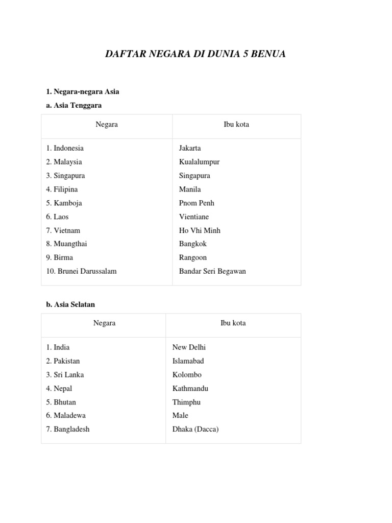 Daftar Negara Di Dunia 5 Benua 1 Negara Negara Asia A Asia Tenggara